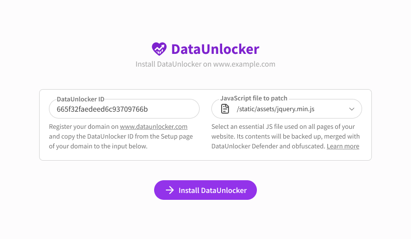 DataUnlocker has a unique installation for each web app and does not contain generic patterns. It is tightly coupled with web app’s code and uniquely obfuscated so that blockers have no chance to decouple DataUnlocker’s code from web app’s code.